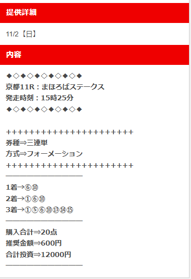 無料情報で天秋取れました!! 思い出せば天春も取らせてもらって、1年あっという間だな~と。 20,080円的中の回収率418%。 中々の的中率ですね、有馬記念まで突っ走って的中ラッシュお願いします