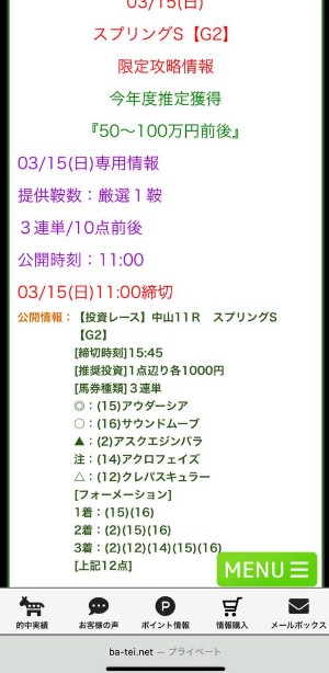 弥生賞カチカチの結果だったけどよく当ててくれました、そこを高く評価しています。 競馬予想会社なら硬い決着と分かっていれば買い方や1点当たりの投資金額が変動しますからね、そのへんの予想は上手いなと感じました。