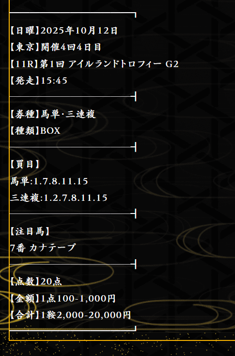 アイルランドトロフィー無料予想2-7-15的中! 実質この買い目で3連単も当たっていたけど、無料情報と有料情報の差は配当部分にあるんだろうな。 3連複でも推奨通り馬券買ったから9万1000円払い戻しで大きすぎる的中! 三日間開催最終日も予想出るかな?3連休で休みだから出してほしー!