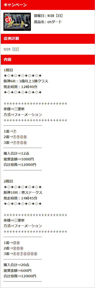 阪神6R→ ⑦-⑤-⑪ 払戻金/105,850円 阪神10R→ ⑯-⑮-⑬ 払戻金/12,050円 2鞍中2鞍的中!! 一発目105万8500円的中からの7万2300円払い戻し! 7万が小さく見えるけど7万の配当も凄い事! 7万がかすむほどの的中でスプリンターズS買いそびれました>< でもめっちゃ荒れてたから馬券買ってたら大火傷していたかもTT 結果オーライで特大収支ゲットです!