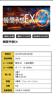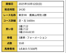 5千円の馬券代だったから極論、10万位稼げれば競馬予想会社使う意味あるかなって個人的見解だったけど約8倍期待を超えてきました。